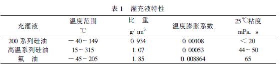 在實際使用中, 一般儀表技術人員都能注意小心使用, 很少出現上述故障。而法蘭式液位變送器的工作特性變成非線性的原因, 大多數是由于毛細管中的灌充液泄漏所致。一般情況下, 灌充液的密封是非常好的, 正確使用一臺此類變送器, 在3 ~ 6 年內, 泄漏量很小,線性還可以。如果使用時間更長的話, 由于微小泄漏的長期積累, 就會使灌充液過少,有時可以明顯看到感應膜片凹陷, 從而使變送器失去線性度而不可用。另一種情況是由于儀表技術人員未能注意工作溫度所致。下面我們先看一看常用的幾種灌充液的特性,如表1 。
