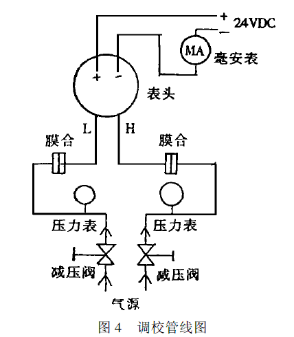 雙法蘭液位變送器(量程范圍為0 ~ 12.6kPa) 為例, 按以下步驟進行調校。按圖4 連接好氣路和線路。