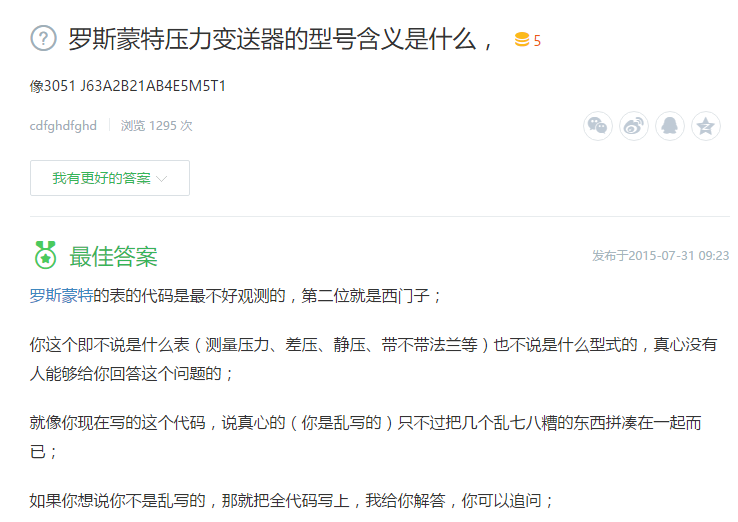 羅斯蒙特的表的代碼是最不好觀測的,第二位就是西門子;你這個即不說是什么表(測量壓力、差壓、靜壓、帶不帶法蘭等)也不說是什么型式的,真心沒有人能夠給你回答這個問題的;就像你現在寫的這個代碼,說真心的(你是亂寫的)只不過把幾個亂七八糟的東西拼湊在一起而已;如果你想說你不是亂寫的,那就把全代碼寫上,我給你解答,你可以追問;