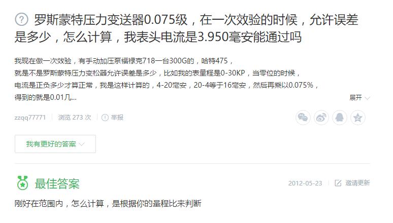 1、羅斯蒙特壓力變送器0.075級(jí),在一次效驗(yàn)的時(shí)候,允許誤差是多少,怎么計(jì)算,我表頭電流是3.950毫安能通過(guò)嗎(我現(xiàn)在做一次效驗(yàn),有手動(dòng)加壓泵福祿克718一臺(tái)300G的,哈特475,就是不是羅斯蒙特壓力變松器允許誤差是多少,比如我的表量程是0-30KP,當(dāng)零位的時(shí)候,電流是正負(fù)多少才算正常,我是這樣計(jì)算的,4-20毫安,20-4等于16毫安,然后再乘以0.075%,得到的就是0.01幾了啊,那我在零位的時(shí)候如果是3.988毫安,或者3.980那不都通不過(guò)啊,我記得以前這種小誤差都可以忽略不記得啊,請(qǐng)高人指點(diǎn)一二,急)