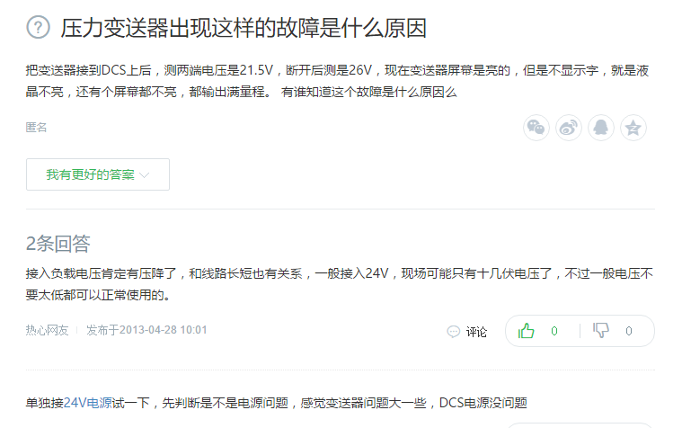 單獨接24V電源試一下,先判斷是不是電源問題,感覺變送器問題大一些,DCS電源沒問題。
